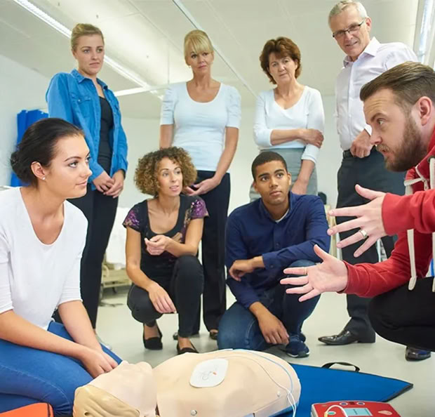 Short, interactive workshops that teach vital life-saving skills. Participants learn how to perform CPR and use an Automated External Defibrillator (AED) safely and confidently.